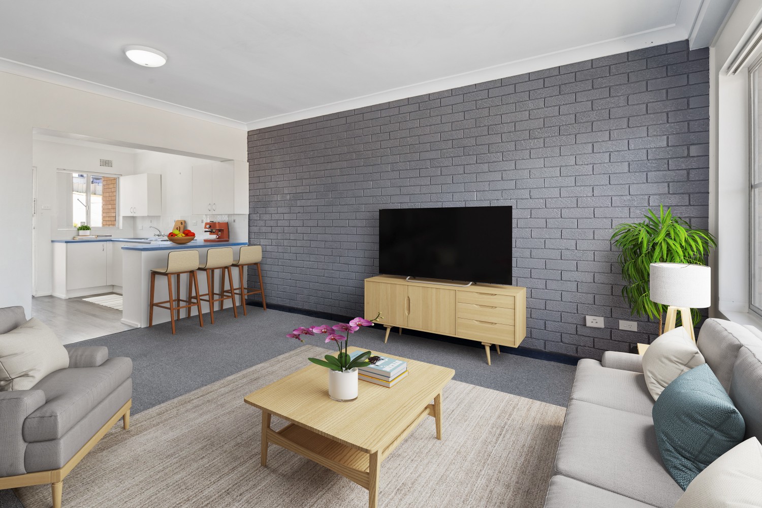 The modern kitchen, dining and lounge are open plan with large windows and access to the spacious balcony.