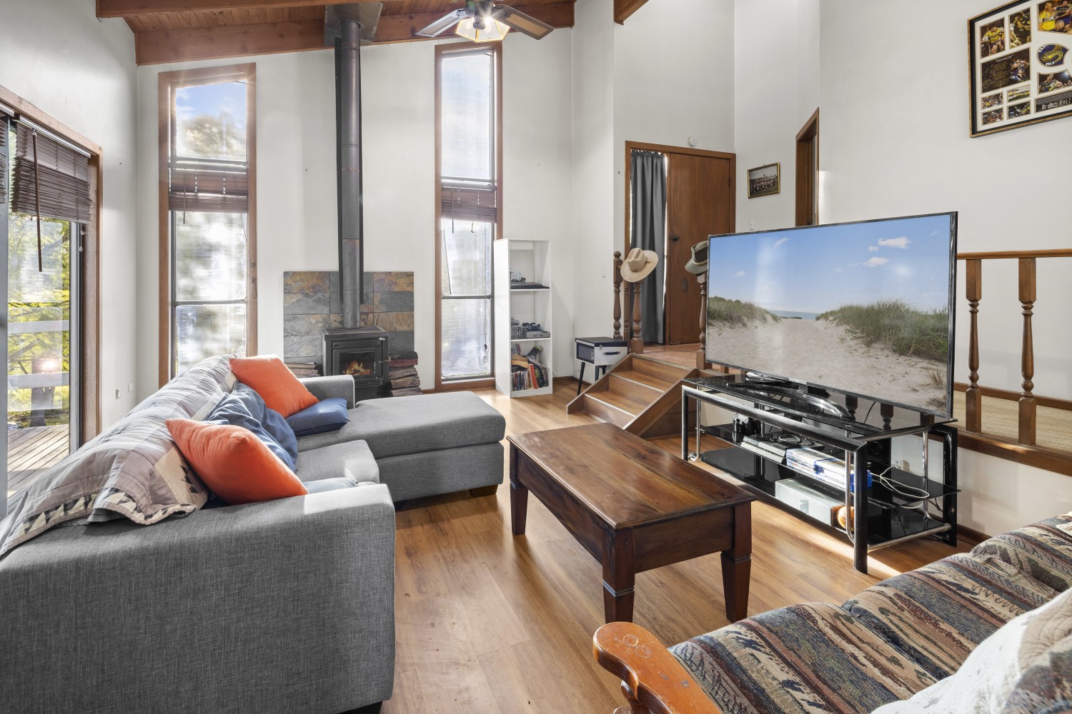 The large lounge room features a slow combustion fireplace and access to the deck.
