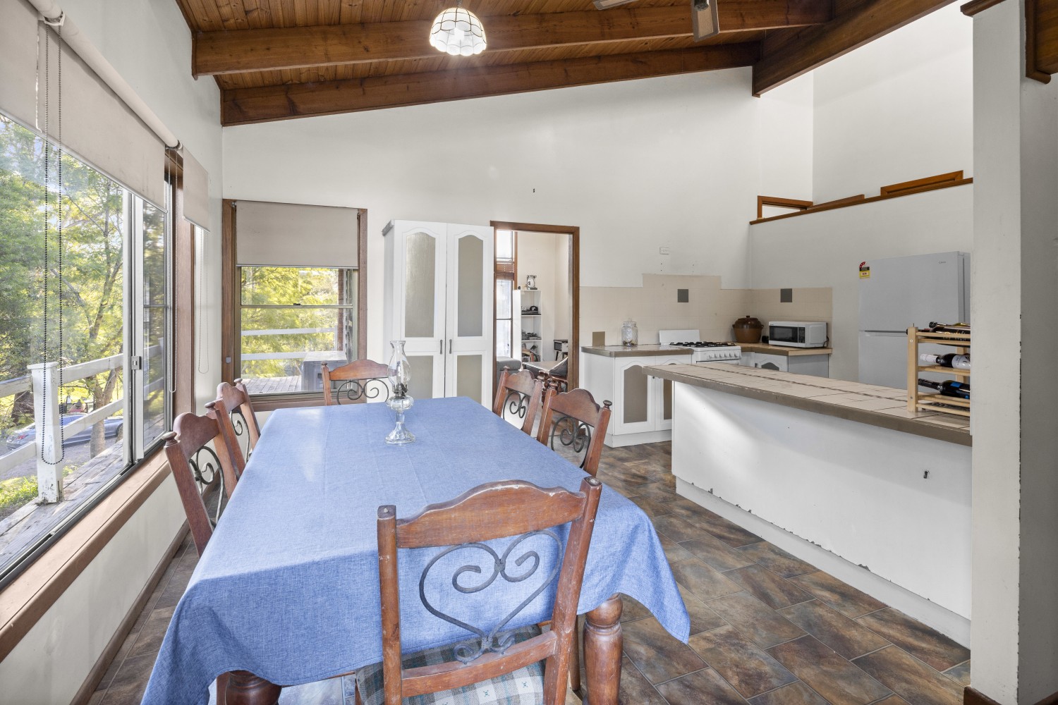 The property consists of a split level home, featuring exposed timber cathedral ceilings and wrap around deck.