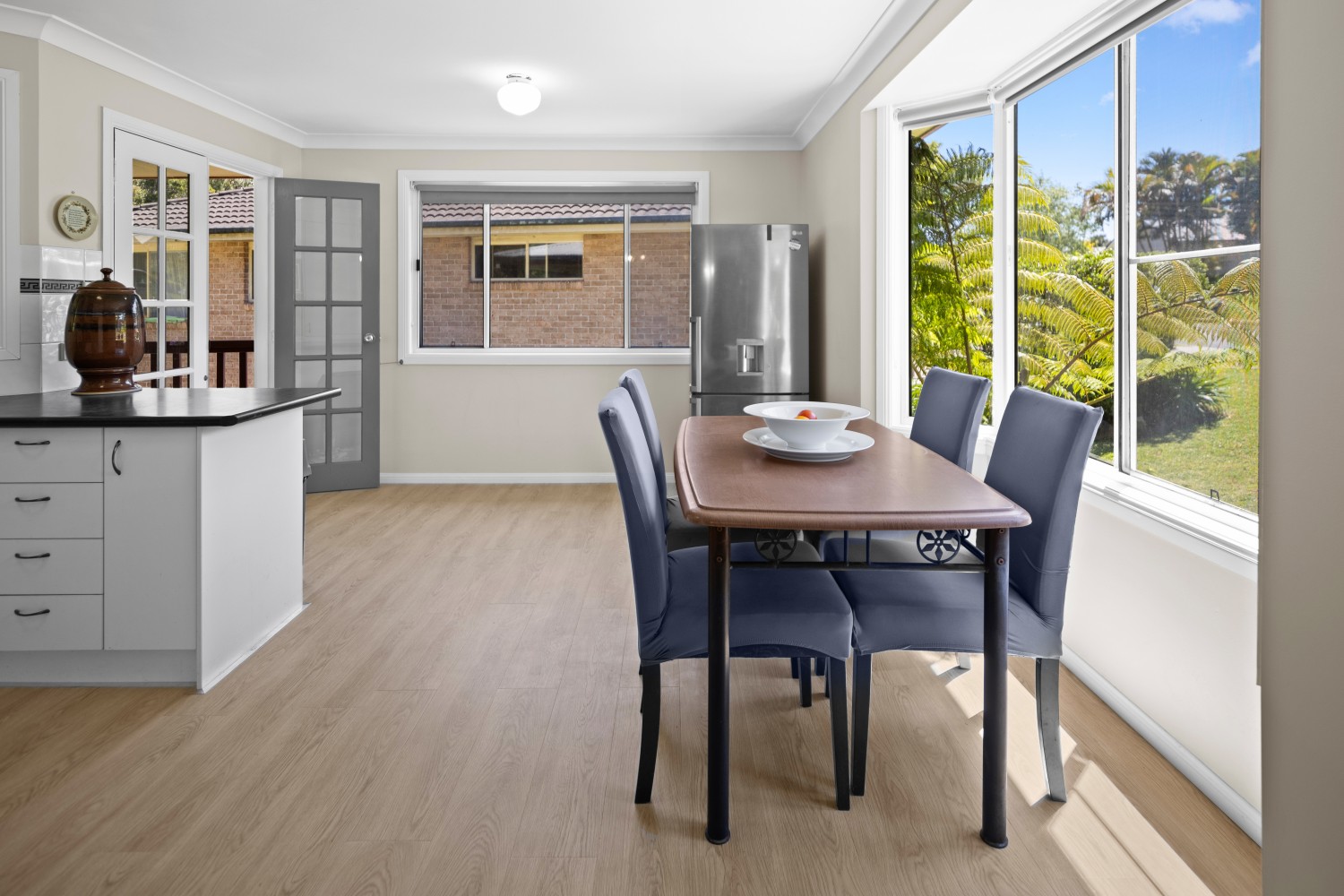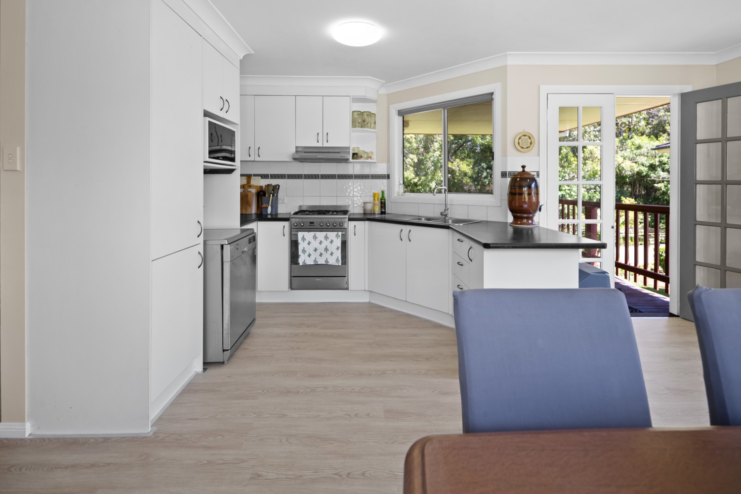 The living spaces benefit from an open-plan design, letting in lots of natural light to create a warm and welcoming atmosphere. The cleverly designed kitchen is a standout feature, offering plenty of bench space and a light, airy feel that makes meal preparation a pleasure. Step out through the french doors onto the deck, overlooking lush bushland, ideal for a lazy BBQ after a day at the beach.