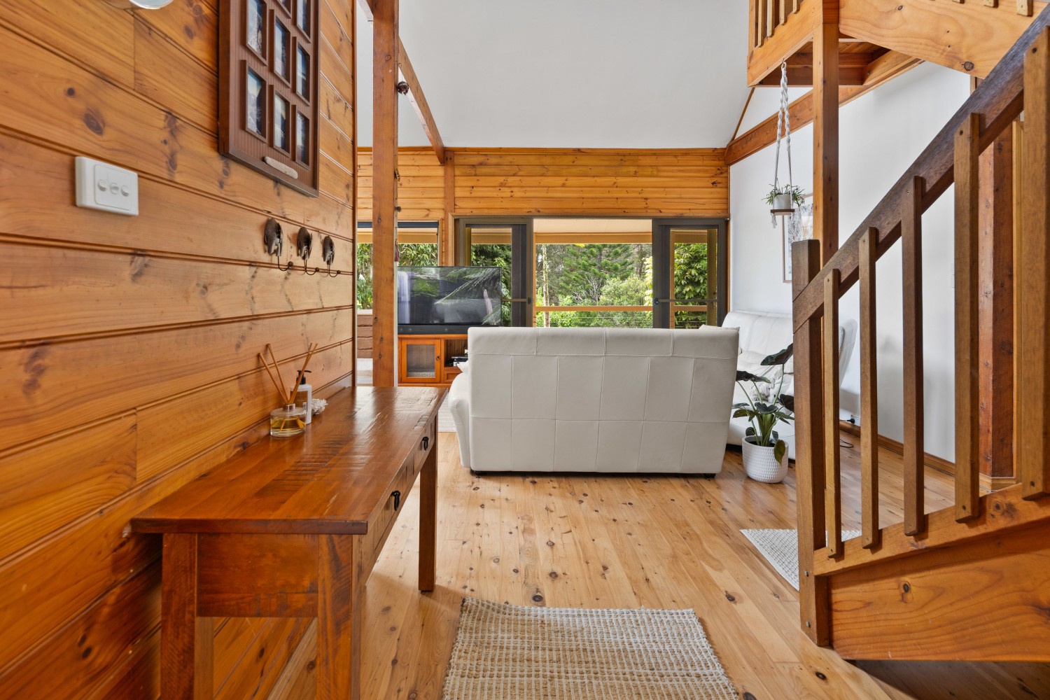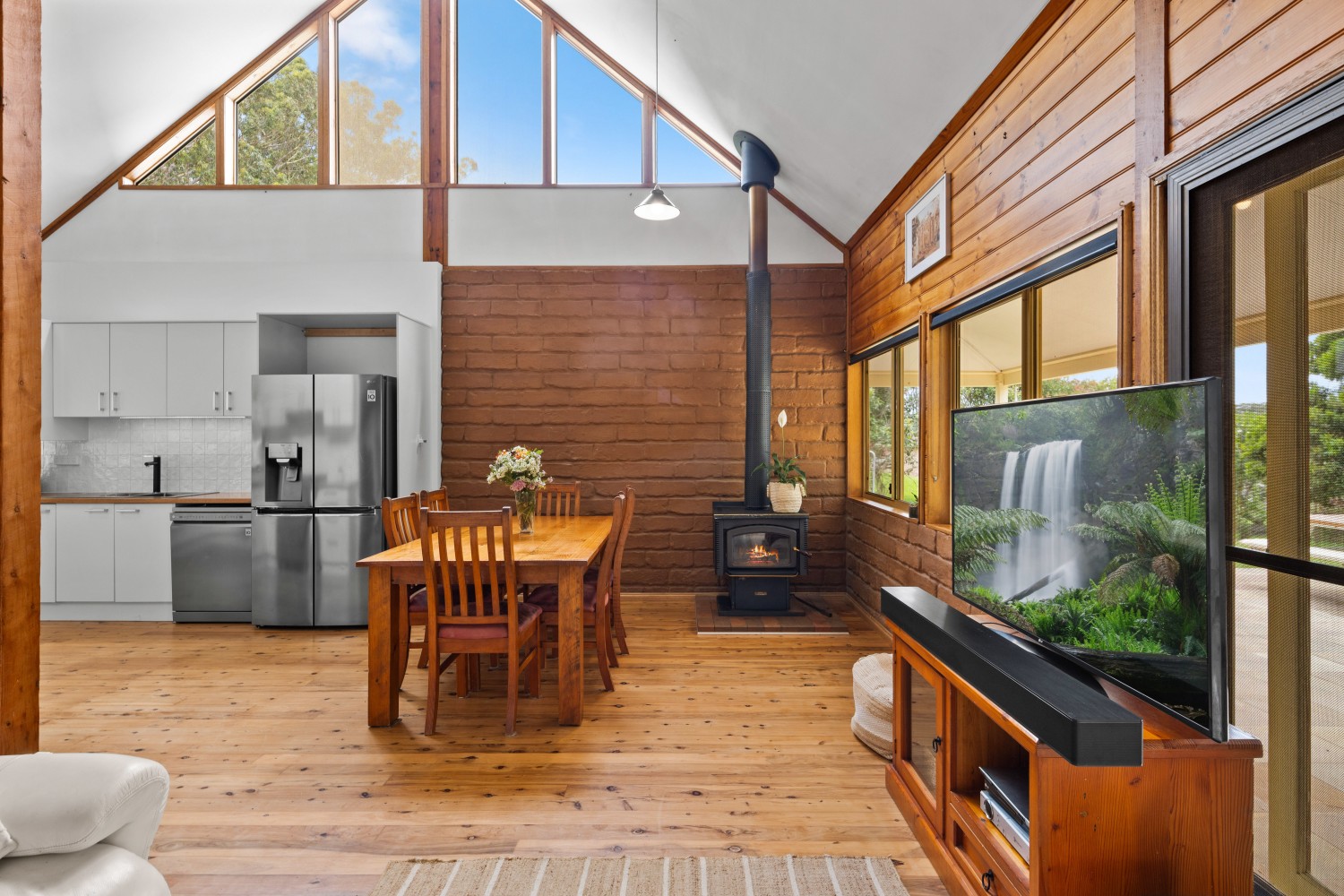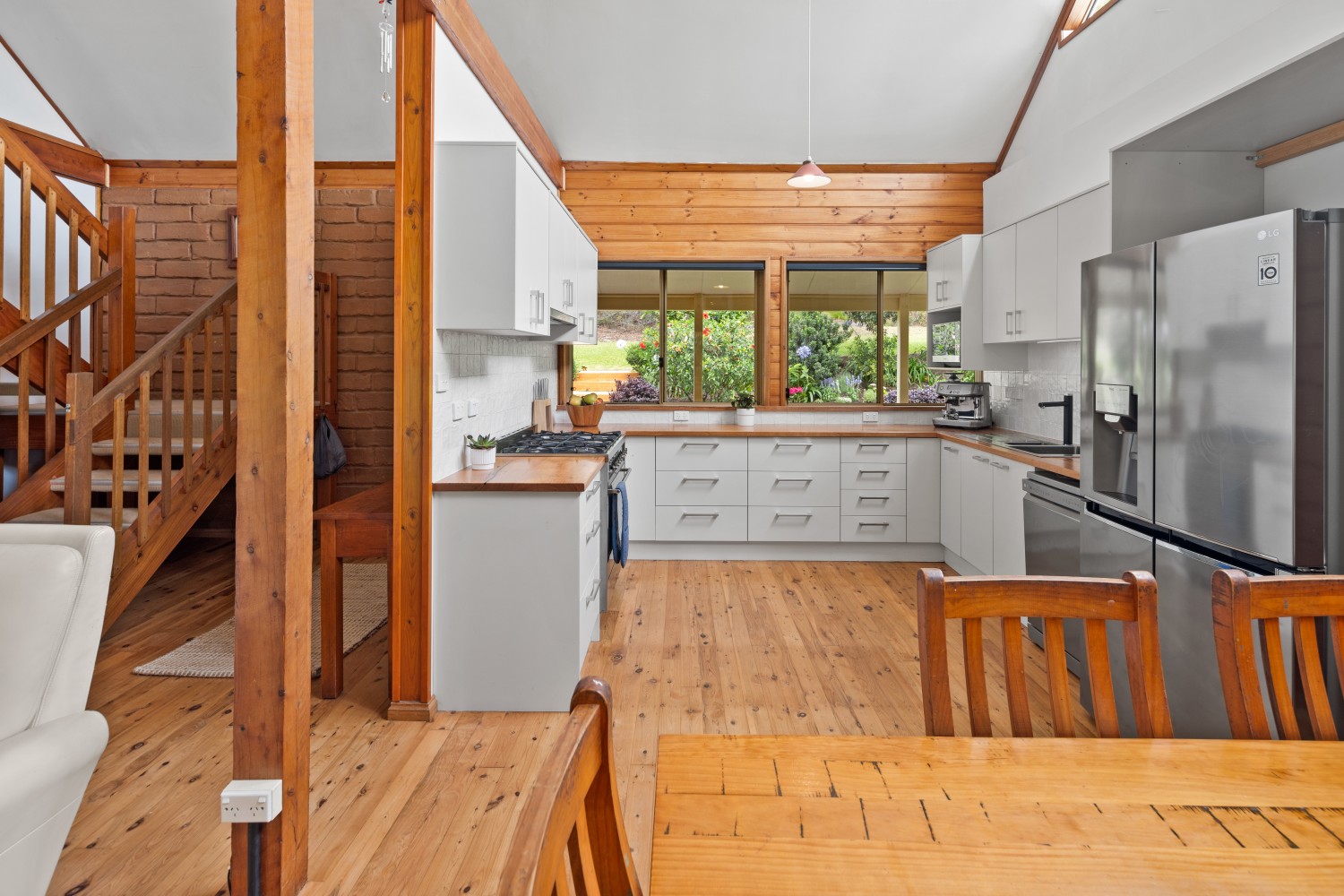 Step inside to a wide hallway that opens into the heart of the home, with abundant natural light. The open plan lounge, dining and new kitchen, is a welcoming and functional space. Boasting large windows that overlook the lush garden, cathedral ceilings, timber floors, and a slow combustion fire.