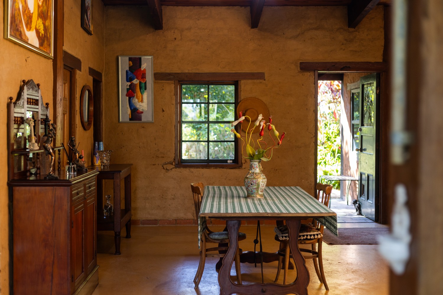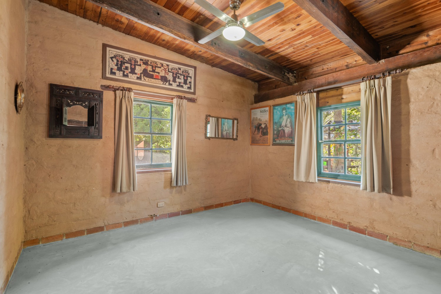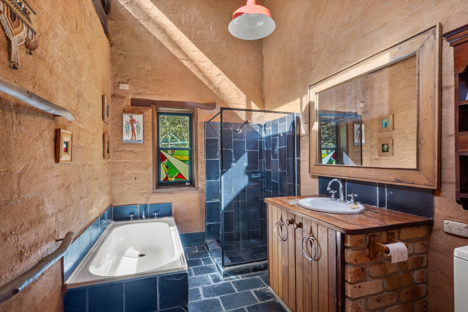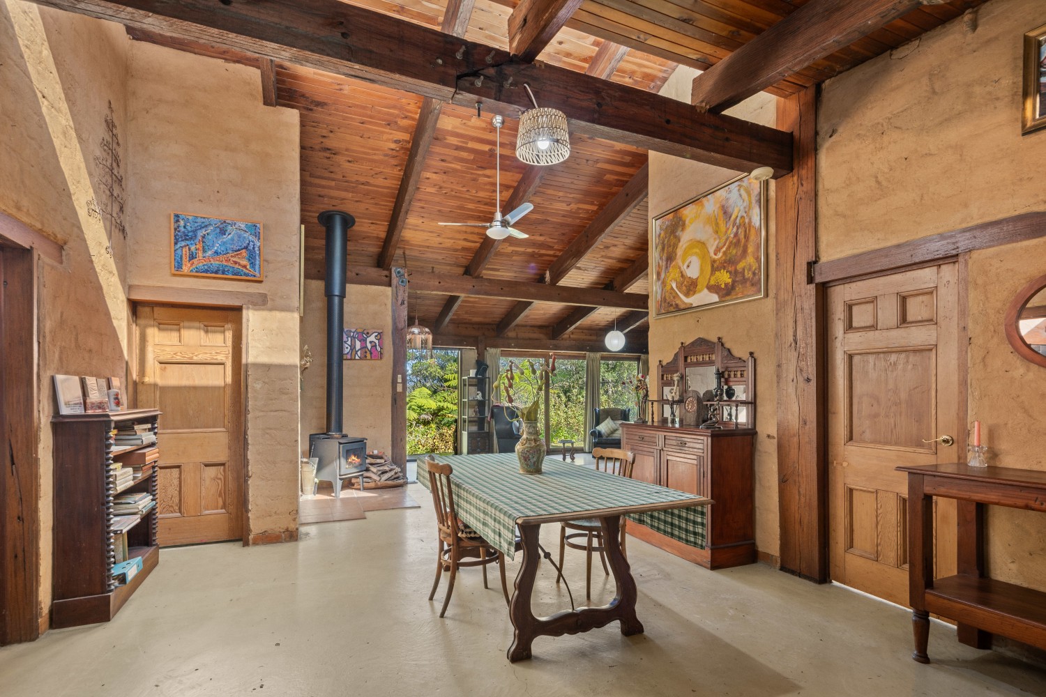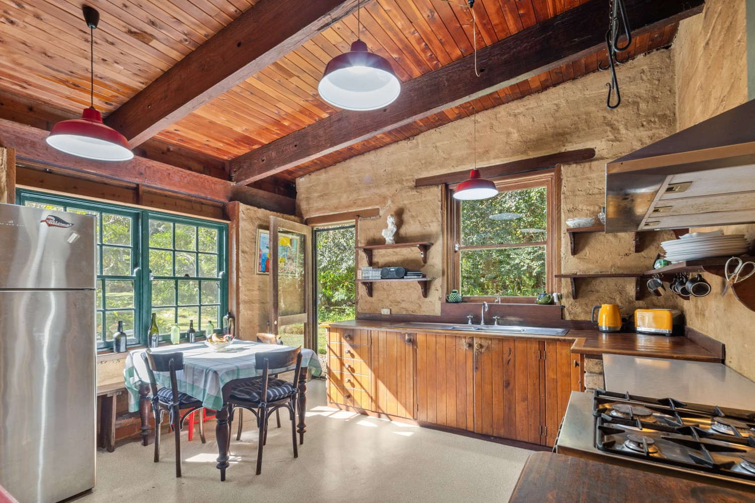 Main Home: Constructed from environmentally friendly mud brick, the main home features a spacious open-plan living and dining area with a cozy wood fire and large windows that frame the stunning gardens. It includes three generously sized bedrooms, a bathroom, laundry, and an eat-in kitchen, each offering picturesque views of the property. This home is council approved. Both homes are in need of a little TLC.