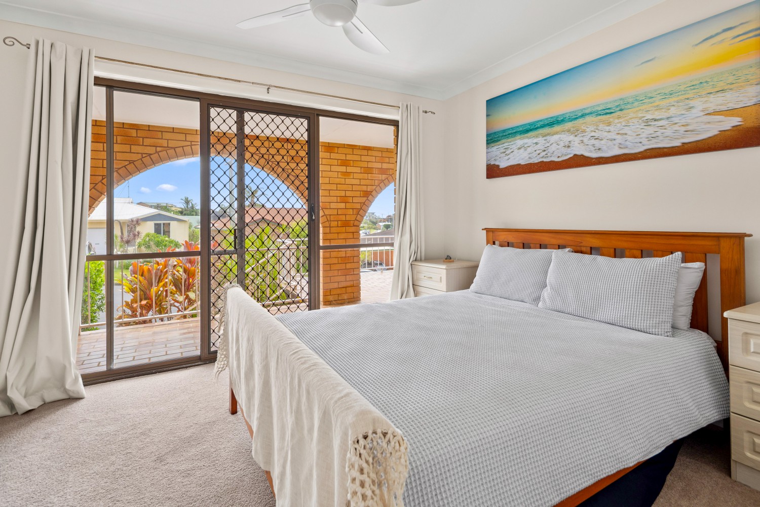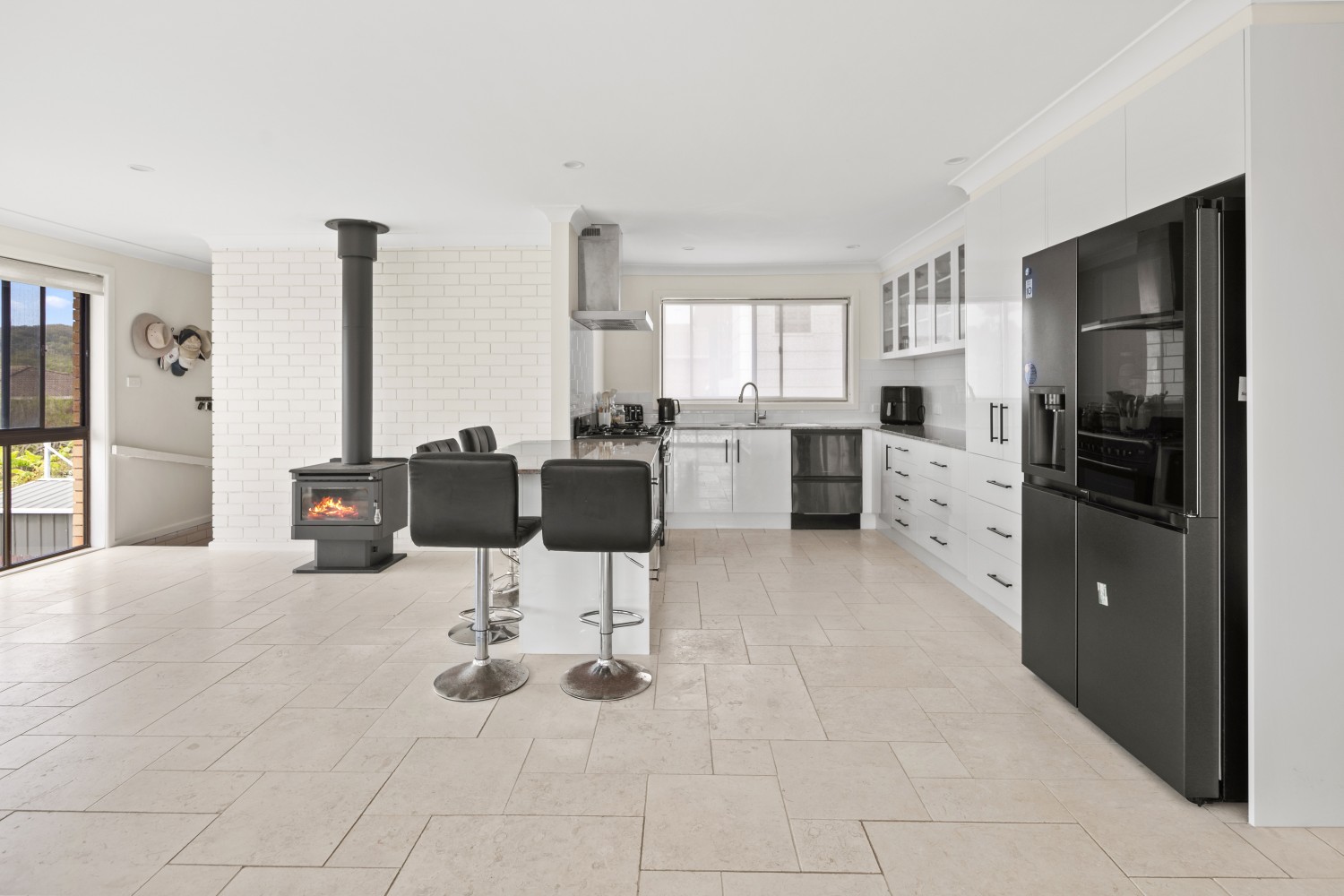 Set proudly above its surroundings, the home enjoys cooling sea breezes, abundant natural light, and sliding glass doors to add to this flow of inside-outside entertaining, along with an elevated sense of privacy. Inside, a spacious open-plan living and dining area creates an inviting hub for everyday living and entertaining, beautifully complemented by travertine flooring throughout.